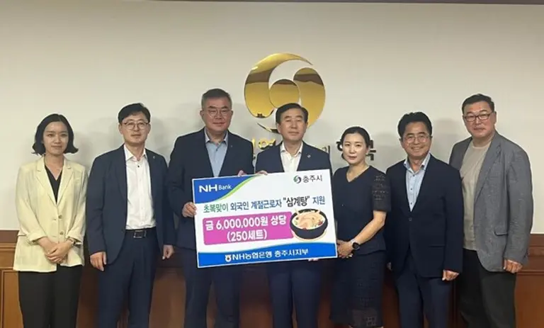 농협은행은 전국 9개 시·군 외국인 계절근로자에게 보양식을 대접할 예정이다. 첫 방문지로 충주시를 선정해, 충주시청에 삼계탕 500인분 비용을 전달했다.