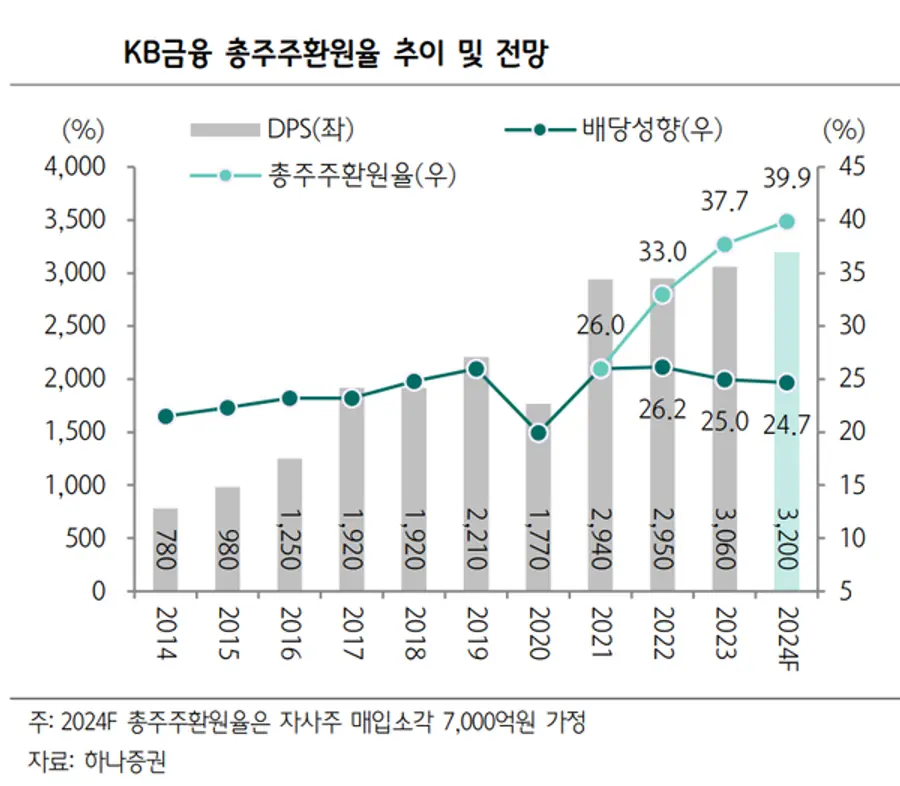 이어 최 연구원은 "KB금융은 총주주환원율 40%를 가장 먼저 상회할 수 있는 은행"이라며 "밸류업 대장주 지위를 유지할 것으로 예상한다"고 높이 평가했다.