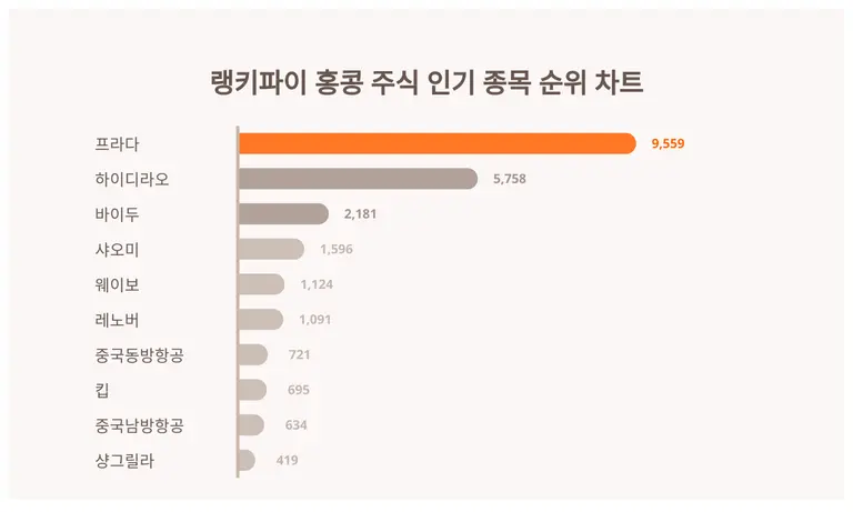 랭키파이 분석 결과 홍콩 주식 인기 종목 트렌드지수 순위 1위는 9,559포인트를 받은 프라다, 2위는 5,758포인트인 하이디라오, 3위는 2,181포인트의 바이두(이)다.