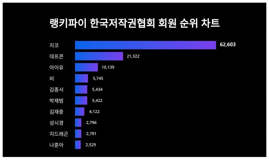 랭키파이에 따르면 7월 1주차 기준 한국저작권협회 회원 트렌드지수 1위는 지코, 2위는 데프콘이다.