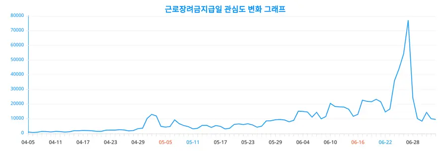 아래 일간 트렌드 그래프는 근로장려금지급일에 대한 일간 트렌드 변화 추이가 90일간 어떻게 변화했는지를 드러내고 있다.