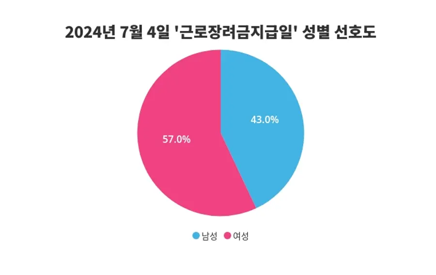 금일 근로장려금지급일에 대한 성별 관심 조사에서는 여성이 57%의 비율로 더 큰 관심을 보이며 성별 간의 차이를 드러냈다.
