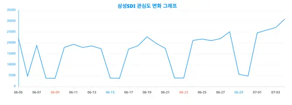 삼성SDI에 관한 트렌드지수는 현재 31,008 포인트를 기록, 전일 27,101 포인트 대비 상승하였다.