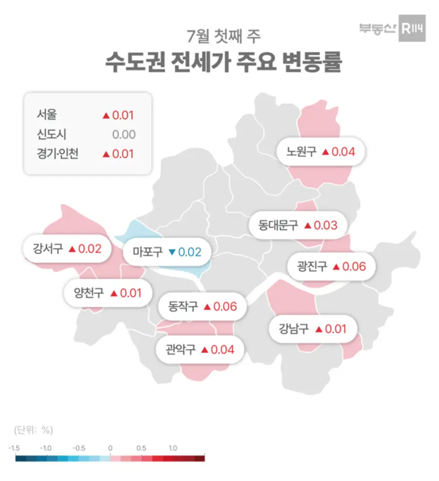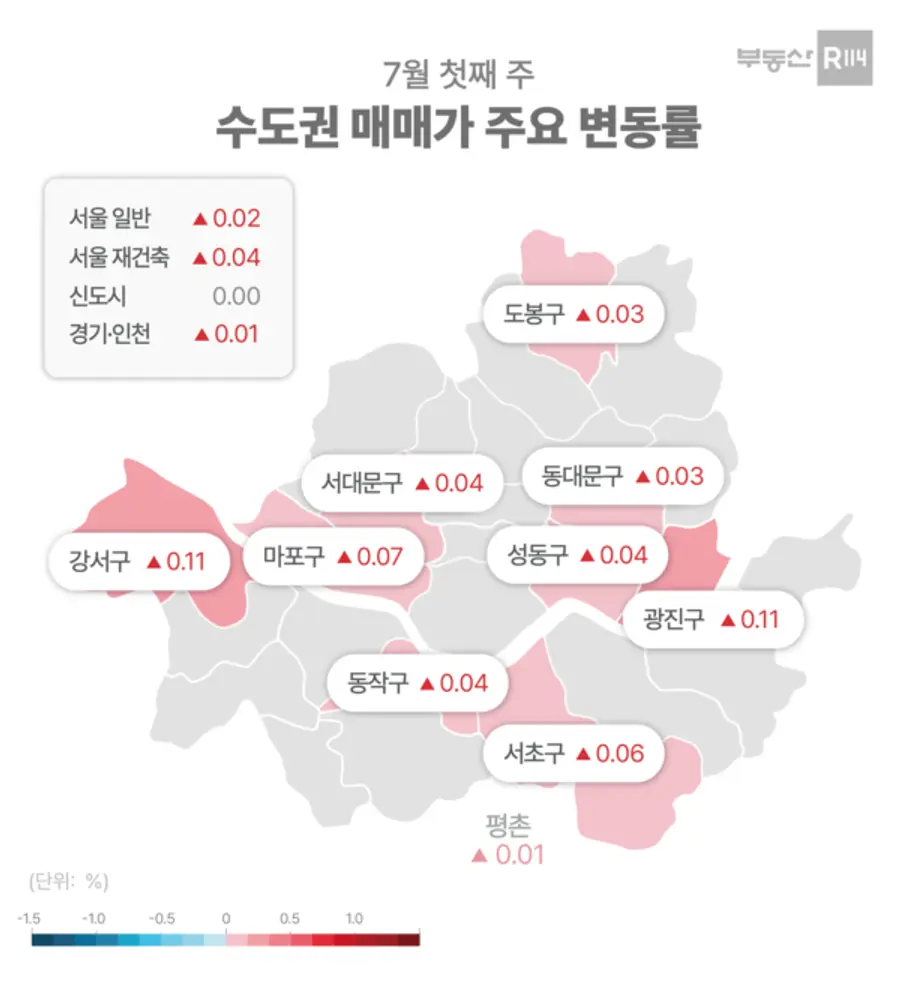 서울은 동북 및 서남권을 중심으로 상승폭이 컸다. 개별지역으로는 △동작(0.06%) △광진(0.06%) △노원(0.04%) △관악(0.04%) △동대문(0.03%) △강서(0.02%) △양천(0.01%) △강남(0.01%) 등이 올랐고 마포는 유일하게 0.02% 내렸다. 신도시는 전 지역이 보합(0.00%)을 기록했다. 경기ㆍ인천은 △이천(0.05%) △수원(0.04%) △화성(0.01%) △군포(0.01%) △광명(0.01%) △인천(0.01%) 등이 상향 조정됐다.