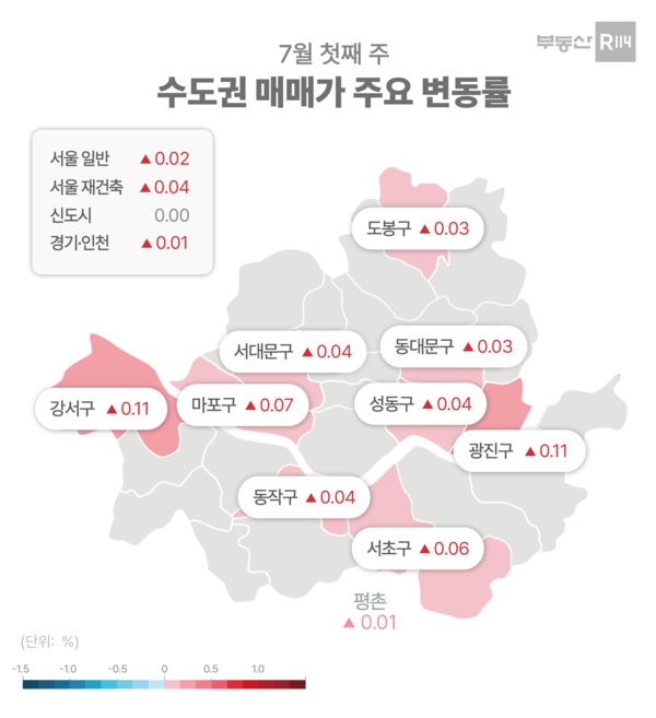 서울은 지난 주 보다 상승지역이 2배 이상(6곳→14곳) 늘며 준상급지 위주로 오름폭이 컸다. 25개구 중 하락지역은 전무했다. 개별지역으로는 △광진(0.11%) △강서(0.11%) △마포(0.07%) △서초(0.06%) △성동(0.04%) △서대문(0.04%) △동작(0.04%) 순으로 올랐다. 신도시는 평촌이 0.01% 뛰었고, 나머지 지역은 모두 보합(0.00%)을 기록했다. 경기ㆍ인천은 △화성(0.04%) △오산(0.02%) △수원(0.02%) △군포(0.02%) △안산(0.01%) △인천(0.01%) 등 경기 남부권을 중심으로 상승한 반면 구리는 수택동 영풍마드레빌, 토평주공5단지 등이 100만원-250만원 빠지며 0.01% 하락했다.
