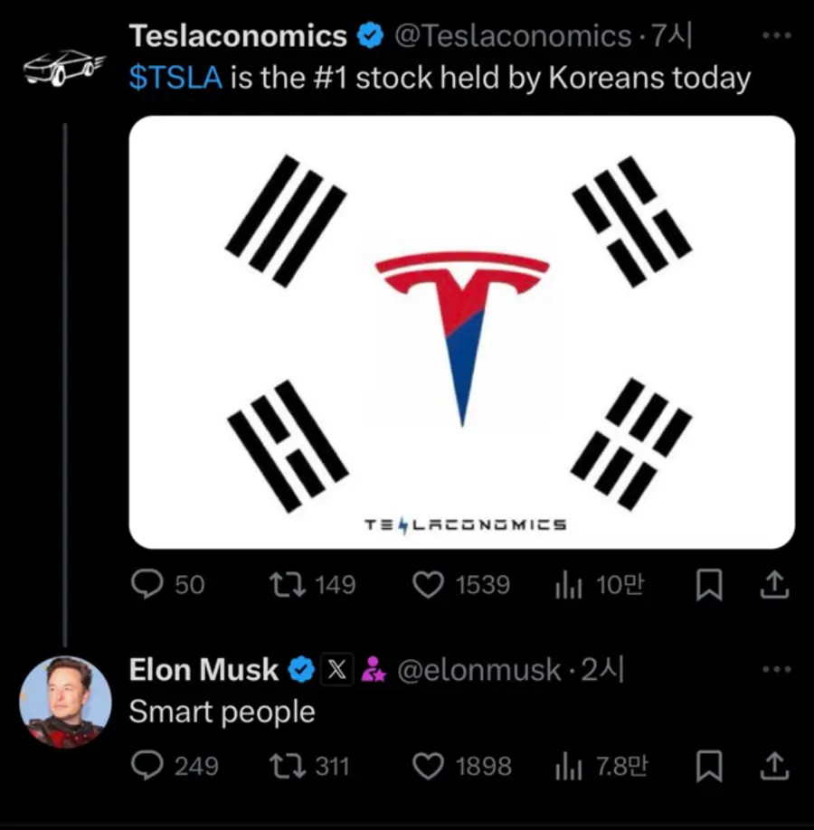 8일 밤(현지시간) 약 30만의 팔로우를 보유한 테슬라코노믹스(@Teslaconomics) 엑스(옛 트위터) 계정에 태극기의 태극 문양을 테슬라 로고로 바꾼 이미지와 함께 "테슬라, 한국인이 가장 많이 보유한 주식($TSLA is the #1 stock held by Koreans today)"이라는 글이 게시됐다.