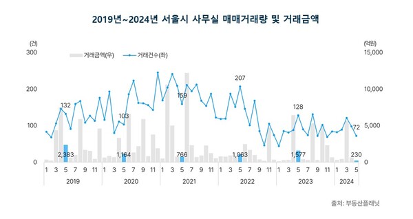 빅데이터 기반 상업용 부동산 전문기업 부동산플래닛(각자대표 정수민, 엄현포)이 9일 발표한 '2024년 5월 서울시 오피스 매매 및 임대시장 동향 보고서'에 따르면 서울시 오피스빌딩 매매거래량은 전월(8건) 대비 37.5% 줄어든 5건으로 확인됐다.