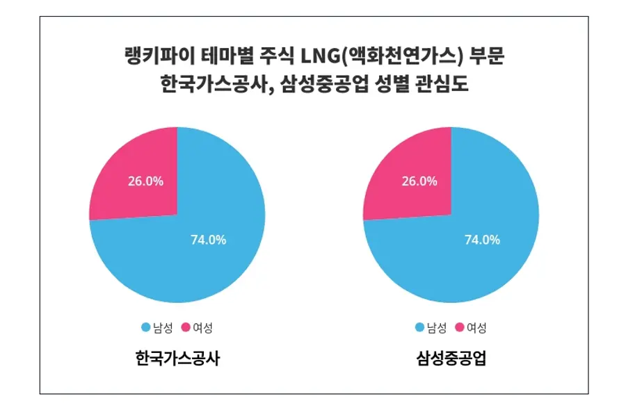 성별 관심도 분석에서 한국가스공사는 '남성'에게 '74%'의 관심을 받고 있으며, 한국가스공사는 여성보다 '남성'에게 높은 관심을 받고 있는 것으로 나타났다.이어 삼성중공업은 '남성'에서 '74%'의 높은 관심도가 나타났으며, 여성보다 '남성'에게 더 많은 관심을 받고 있음이 드러났다.