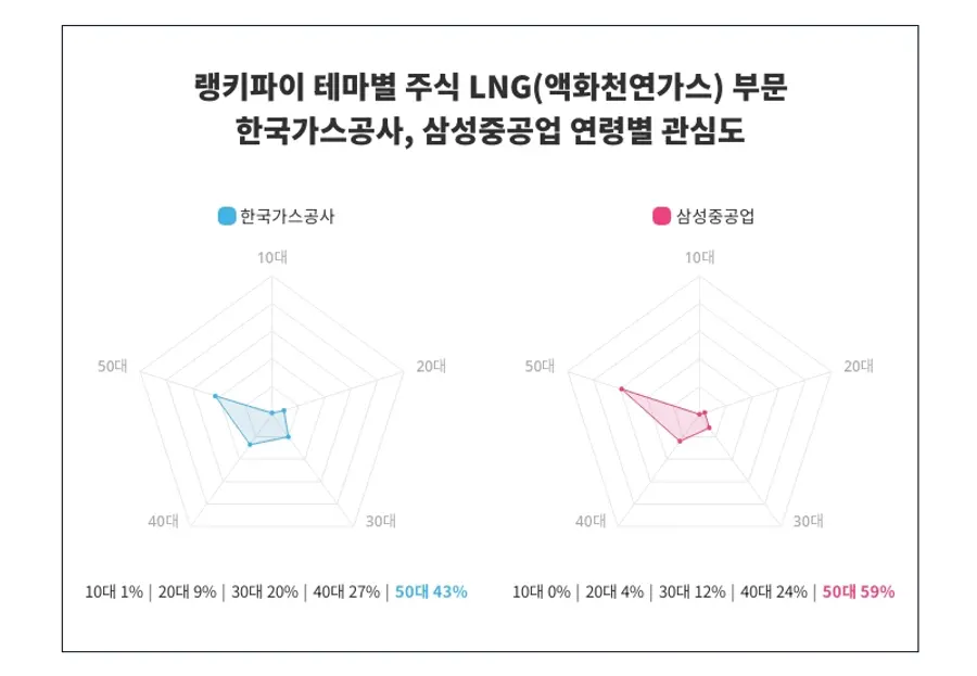연령별 관심도 조사에 따르면, 한국가스공사와 삼성중공업 사이의 관심도는 각 연령대에서 다양하게 분포되어 있음이 확인되었다. 특히, 한국가스공사는 50대에서 43%의 관심도를 보여 가장 관심도가 높은 것으로 나타났다. 더불어 한국가스공사의 관심도는 10대 1%, 20대 9%, 30대 20%, 40대 27%, 50대 43% 순으로 나타났다.