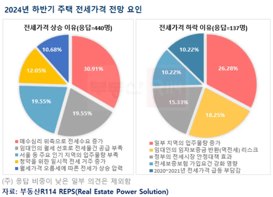 전세가격이 오른다고 응답한 440명 중 30.91%는 매수심리 위축으로 전세수요가 증가할 것으로 예상했다. 수도권 주요지역 위주로 회복된 가격에 대한 부담감과 과거 대비 높은 대출 금리 등으로 위축된 매수심리가 상대적으로 전세 수요를 늘려 가격 상승 압박을 높일 수 있다는 의미다. 그 다음으로는 △임대인의 월세 선호로 전세물건 공급 부족(19.55%) △서울 등 주요 인기 지역의 입주물량 부족(19.55%) △청약을 위한 일시적 전세 거주 증가(12.05%) △월세가격 오름세에 따른 전세가 상승 압력(10.68%) 순으로 나타났다.