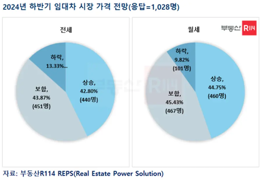 10일 부동산R114가 6월 24일부터 7월 5일까지 전국 1028명을 대상으로 '2024년 하반기 주택 시장 전망' 설문조사에 따르면 응답자 36%가 주택가격 상승을 예상했다. 반면 하락할 것으로 예상한 사람은 21%에 그쳤다. 직전 조사에서 상승응답 30% 하락 25%와 비교해 상승과 하락 응답 격차가 더 벌어졌다. 다만 보합을 전망한 응답자는 10명 중 4명 수준으로 여전히 가장 많은 답변을 차지해 여전히 불확실성이 큰 편이다.