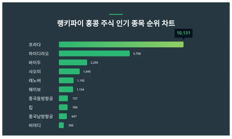 랭키파이 분석 결과 홍콩 주식 인기 종목 트렌드지수 순위 1위는 10,131포인트를 받은 프라다, 2위는 5,758포인트인 하이디라오, 3위는 2,295포인트의 바이두(이)다.