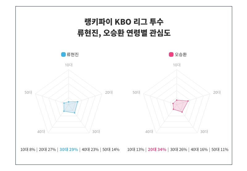 연령별 관심도 조사에서 류현진과 오승환의 관심도가 다양한 연령층 사이에서 어떻게 분포되어 있는지 명확히 드러났다. 조사 결과, 류현진은 특히 30대에서 29%의 높은 관심도를 기록하며 가장 큰 관심을 끌고 있는 것으로 나타났다. 류현진의 인기는 10대 8%, 20대 27%, 30대 29%, 40대 23%, 50대 14%순으로 이어지며, 각 연령대별에서 어떠한 관심을 받고 있는지가 조사되었다.