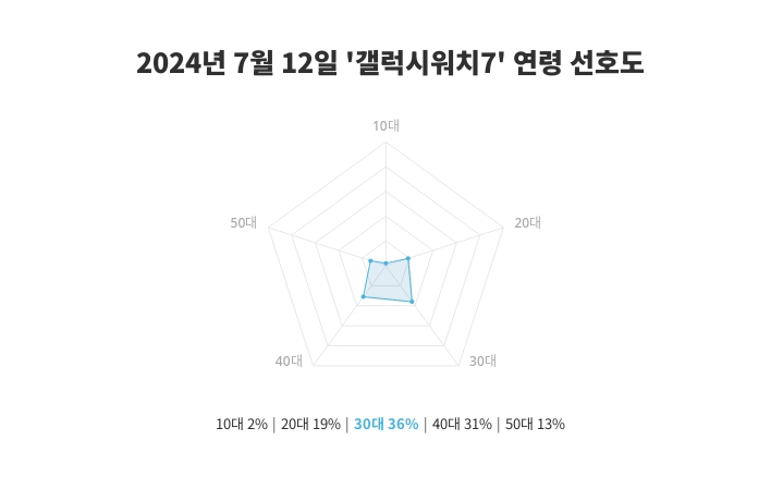갤럭시워치7의 최근 연령별 선호도는 전일의 10대 3%, 20대 20%, 30대 35%, 40대 29%, 50대 14% 결과와 비교해 금일 10대 2%, 20대 19%, 30대 36%, 40대 31%, 50대 13%의 결과로 나타나, 연령층별 변화를 확인할 수 있다.