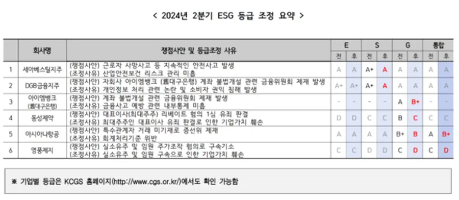 한국ESG기준원(KCGS)는 지난 11일 2분기 ESG 평가·등급 소위원회를 개최, 총 6개사의 ESG 등급을 하향 조정했다고 15일 밝혔다.
