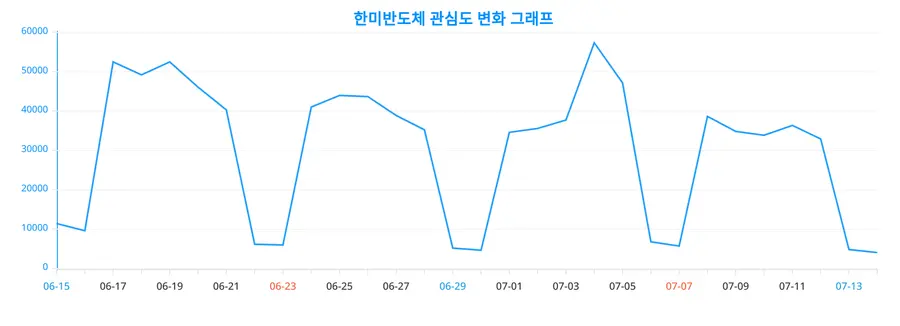 한미반도체에 관한 트렌드지수는 현재 4,081 포인트를 기록, 전일 4,852 포인트 대비 하락하였다.