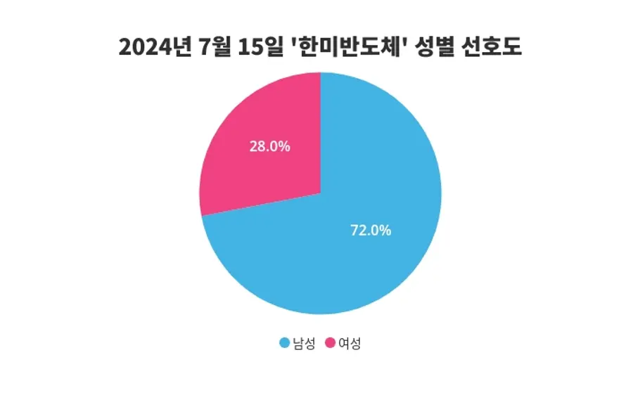 특히, 한미반도체에 대한 성별 관심도 조사 결과, 남성이 72%의 비율로 더 높은 관심을 보이는 것으로 나타나, 이 인기 키워드에 대한 성별편차를 드러냈다.
