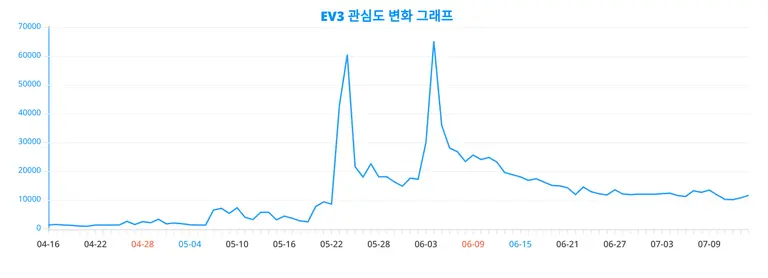 이번에 공개된 EV3 관련 90일간 트렌드 변화 그래프는 트렌드 변동을 데이터로 흥미롭게 보여주고 있다.