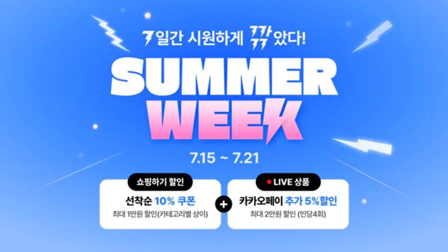 라이브 상품에 한해 ‘썸머 위크’ 기간 중 카카오페이로 결제하면 5% 즉시 할인(결제 건당 최대 2만원, 기간 중 인당 최대 4회)혜택이 주어진다.