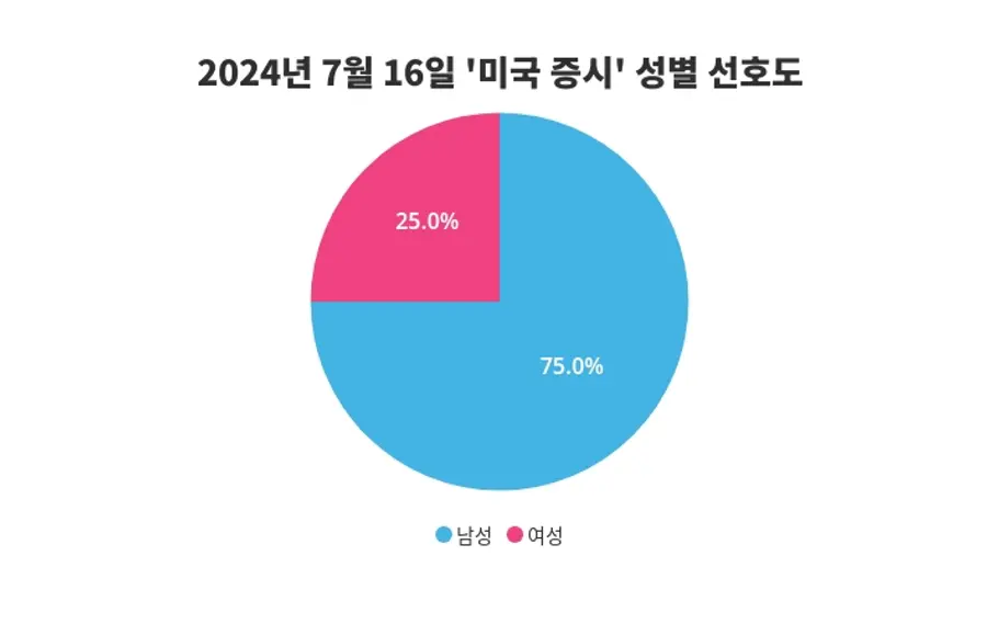 특히, 미국 증시에 대한 성별 관심도 조사 결과, 남성이 75%의 비율로 더 높은 관심을 보이는 것으로 나타나, 이 인기 키워드에 대한 성별편차를 드러냈다.