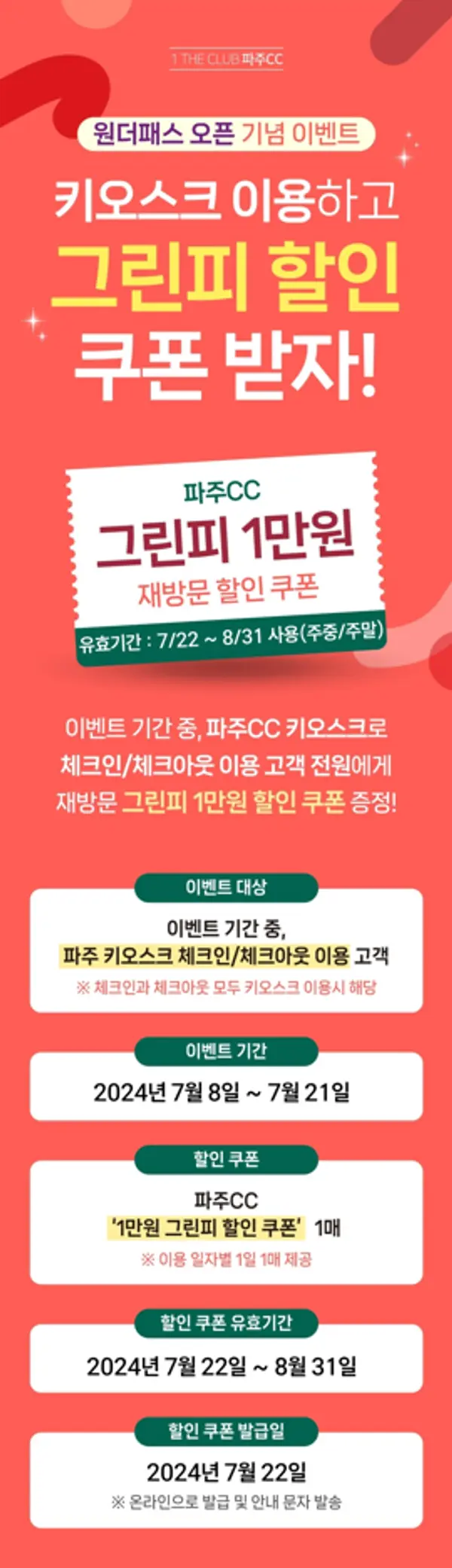 또 파주CC는 원더패스 서비스 오픈을 기념해 시범운영기간에 키오스크로 체크인-체크아웃을 모두 이용한 고객에게 인당 1만원 그린피 할인쿠폰을 제공하는 이벤트를 진행 중이다.