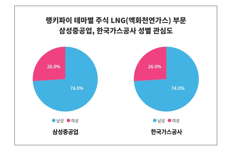 성별 관심도 분석에서 삼성중공업은 '남성'에게 '74%'의 관심을 받고 있으며, 삼성중공업은 여성보다 '남성'에게 높은 관심을 받고 있는 것으로 나타났다.이어 한국가스공사는 '남성'에서 '74%'의 높은 관심도가 나타났으며, 여성보다 '남성'에게 더 많은 관심을 받고 있음이 드러났다.