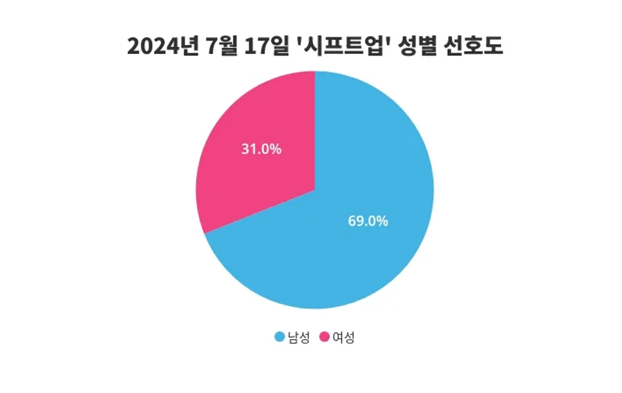 금일 시프트업에 대한 성별 관심 조사에서는 남성이 69%의 비율로 더 큰 관심을 보이며 성별 간의 차이를 드러냈다.