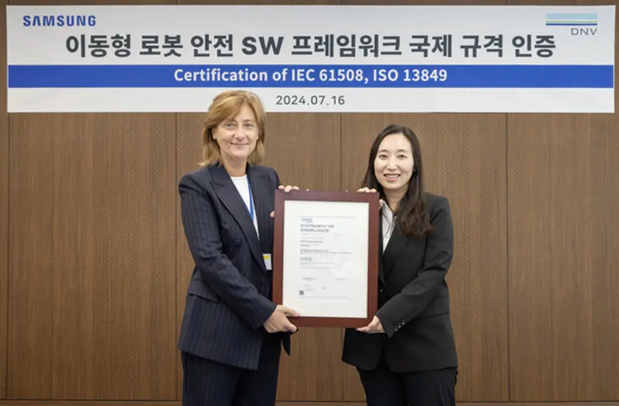 |스마트투데이=이주영 기자| 삼성전자는 자체 개발한 '이동형 로봇용 안전 소프트웨어 프레임워크(Safety Software Framework)'가 국제 인증기관인 DNV(Det Norske Veritas)로부터 국내 최초로 국제 규격 'IEC 61508'과 'ISO 13849' 인증을 동시에 획득했다고 17일 밝혔다.
