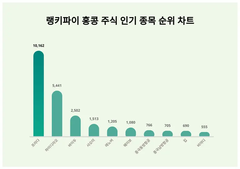 랭키파이 분석 결과 홍콩 주식 인기 종목 트렌드지수 순위 1위는 10,162포인트를 받은 프라다, 2위는 5,441포인트인 하이디라오, 3위는 2,502포인트의 바이두(이)다.