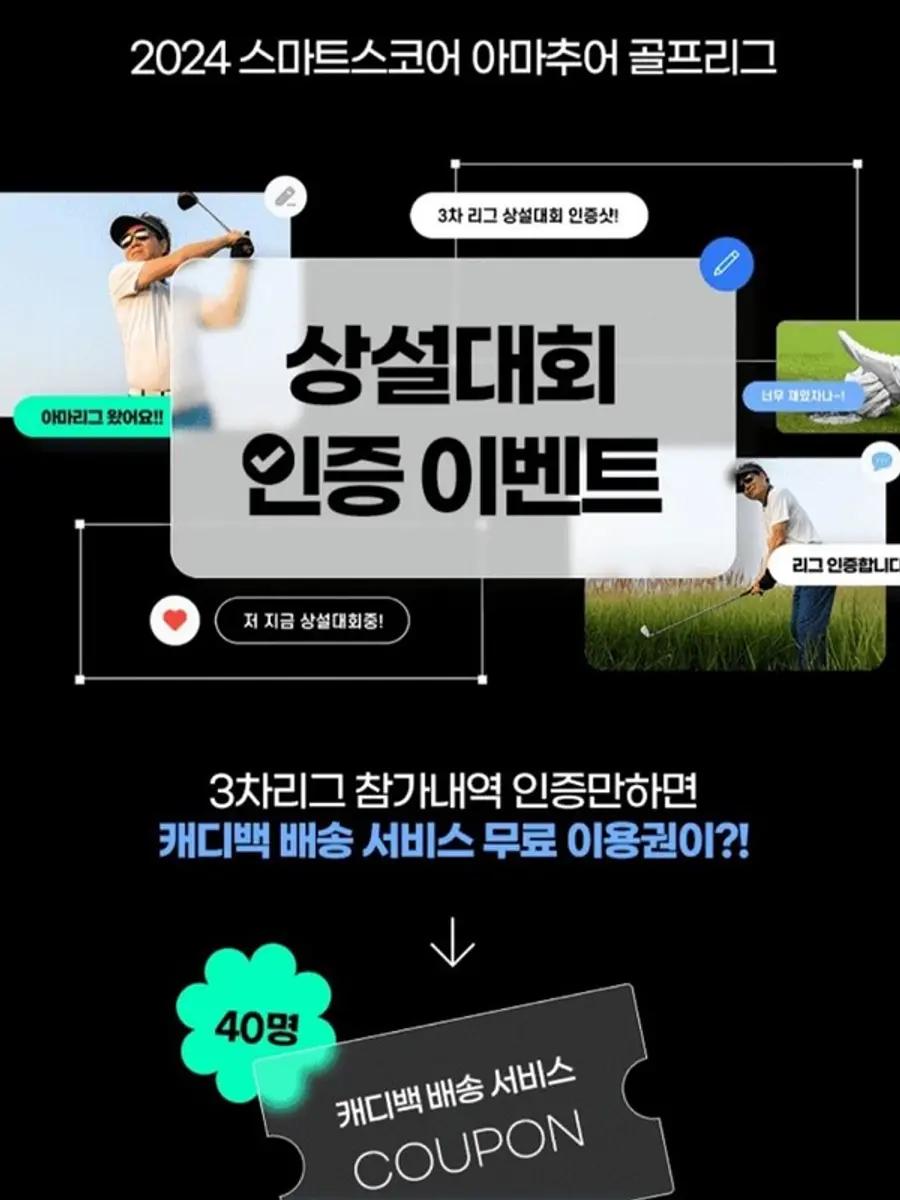 스마트스코어는 3차 정규리그 상설대회 참가자들이 사진 또는 스코어카드를 앱 내 골프리그 게시판에 올려 참가를 인증하면 추첨을 통해 40명에게 캐디백 배송 서비스 무료 이용권을 증정하는 이벤트를 진행한다.