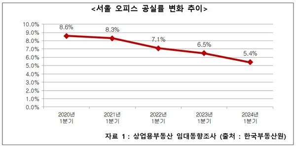 18일 한국부동산원의 ‘상업용부동산 임대동향조사’ 자료에 따르면 올해 1분기 서울 오피스 공실률은 5.4%로 나타났다. 이는 한국부동산원이 오피스 공실률을 집계한 2013년 1분기 이후 최저 수치다. 서울 오피스 공실률은 △2020년 1분기 8.6% △2021년 1분기 8.3% △2022년 1분기 7.1% △2023년 1분기 6.5% △2024년 1분기 5.4%로 꾸준히 하락세를 이어지고 있다.
