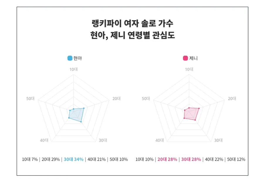 또한 현아와 제니 사이에서 연령별 관심도 분포가 뚜렷이 나타났다. 현아는 30대에서 34%로 가장 높은 관심도를 보여주며, 10대 7%, 20대 29%, 30대 34%, 40대 21%, 50대 10% 순으로 연령대별 관심 분포가 나타났다.