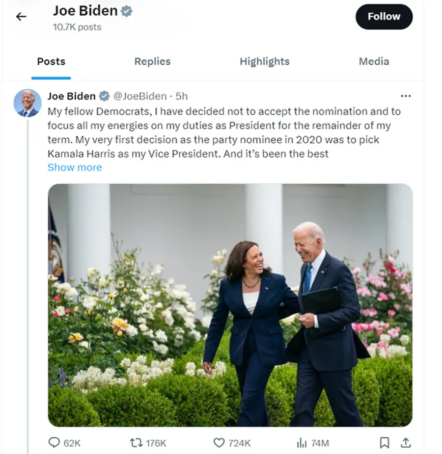 일요일 바이든 대통령이 미국 민주당 대선후보에서 사퇴하면서, 카멀라 해리스 부통령을 민주당 대선후보로 지지한다고 밝혔다.