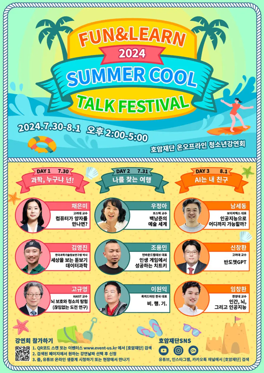 |스마트투데이=김세형 기자| 호암재단(이사장 김황식)이 청소년들을 위한 여름시즌 청소년강연회 "펀앤런, 2024 썸머쿨톡 페스티벌(Fun & Learn, 2024 Summer Cool Talk Festival!)"을 오는 30일부터 8월1일까지 3일간 서울 서초구 삼성금융캠퍼스 비전홀에서 온·오프라인으로 개최한다.