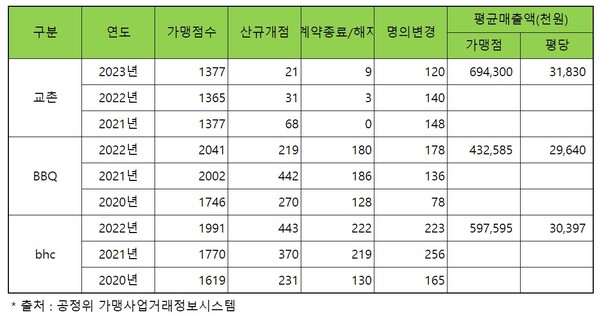 지난해 교촌치킨 가맹점의 계약해지 또는 명의변경 점포수는 129개에 달해 해지율이 9.4%에 달하는 것으로 집계됐다. 2022년과 2021년도 해지 등 점포수는 각각 143개와 148개에 달했다. 당시 해지율은 10.5%와 10.7%를 기록했다.