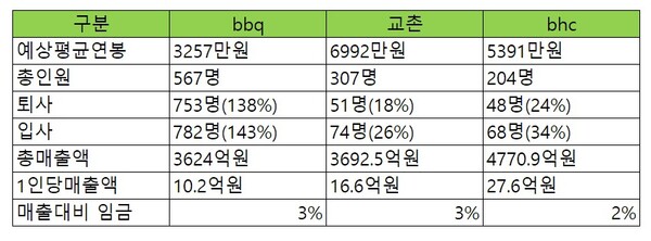 국민연금 가입자 통계자료를 분석해 입,퇴사율을 분석 제공중인 원티드인사이트(크레딧잡)에 따르면 비비큐제너시스의 퇴사율은 138%에 달할 정도로 비정상적이다. 임직원수 대비 퇴사자수가 더 많아 직원 평균 근속기간이 1년도 못된다는 것이다.