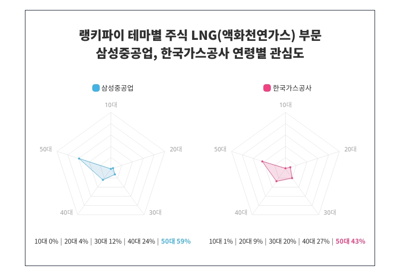 연령별 관심도 조사에 따르면, 삼성중공업과 한국가스공사 사이의 관심도는 각 연령대에서 다양하게 분포되어 있음이 확인되었다. 특히, 삼성중공업은 50대에서 59%의 관심도를 보여 가장 관심도가 높은 것으로 나타났다. 더불어 삼성중공업의 관심도는 10대 0%, 20대 4%, 30대 12%, 40대 24%, 50대 59% 순으로 나타났다.