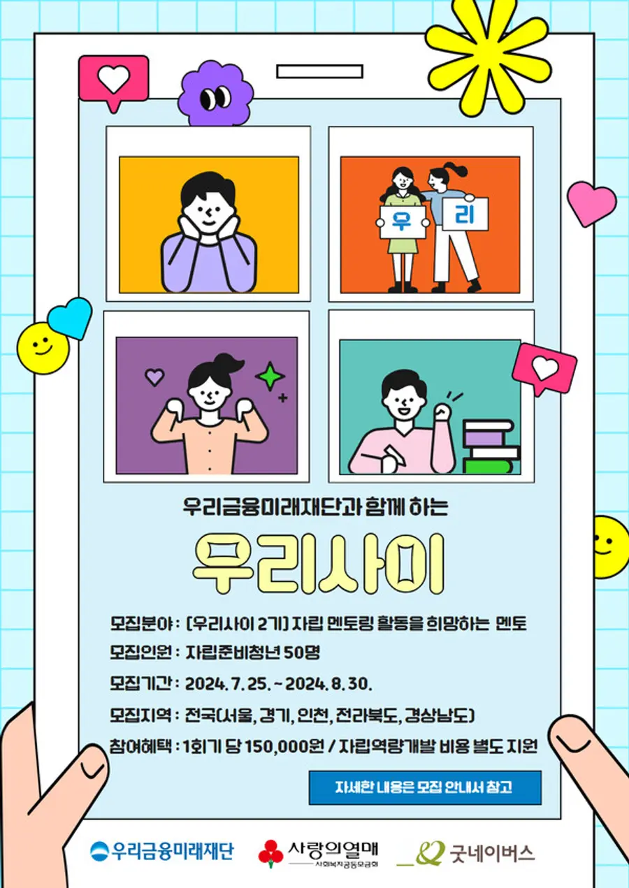 |스마트투데이=김국헌 기자| 우리금융미래재단이 25일부터 오는 8월 30일까지 자립준비청년을 지원하는 사회공헌사업 ‘우리사이’ 2기를 모집한다고 이날 밝혔다.