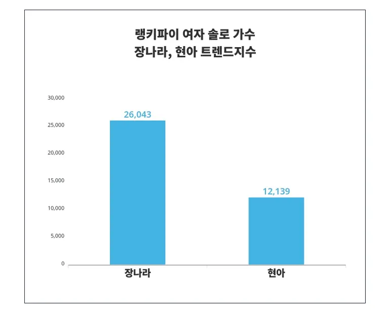 랭키파이의 7월 4주차 여자 솔로 가수 분석에 따르면, 장나라가 '26,043포인트'로 리드 하고 있으며, 현아가 '12,139포인트'로 그 뒤를 이었다. 두 트렌드 사이의 트렌드지수 차는 '13,904포인트'로 집계되었다.