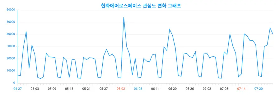 한화에어로스페이스에 관한 트렌드지수 그래프가 최근 업데이트 되었으며, 현재 40,197 포인트를 기록, 전일 45,293 포인트 대비 하락하였다.