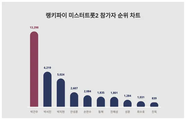 먼저, 박건우가 선두를 달리고 있다. 박건우는 미스터트롯2 참가자 순위 내 13,298포인트를 기록해 1위로 꼽혔다.