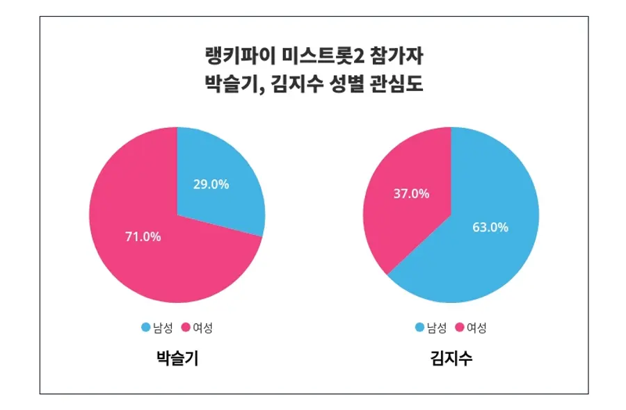 랭키파이의 데이터는 직전 주(2024년 7월 22일~28일) 포털 검색량과 빅데이터 점수 분석을 통한 지수화를 기본으로 하고 있으며, 이 데이터를 활용해 두 가지 트렌드에 대한 성별 및 연령별 관심도를 비교, 분석하여 대중의 관심도를 조사하는 데 주력하고 있다.