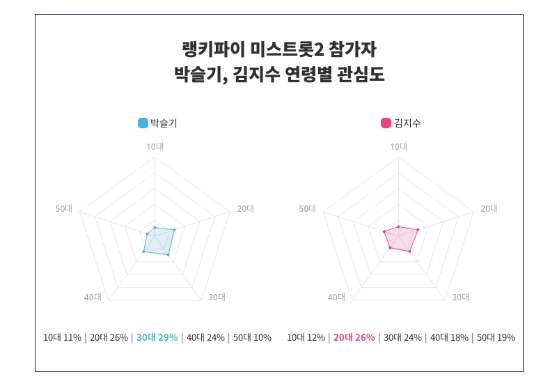 연령별 관심도 조사에서 박슬기와 김지수의 관심도가 다양한 연령층 사이에서 어떻게 분포되어 있는지 명확히 드러났다. 조사 결과, 박슬기는 특히 30대에서 29%의 높은 관심도를 기록하며 가장 큰 관심을 끌고 있는 것으로 나타났다. 박슬기의 인기는 10대 11%, 20대 26%, 30대 29%, 40대 24%, 50대 10%순으로 이어지며, 각 연령대별에서 어떠한 관심을 받고 있는지가 조사되었다.