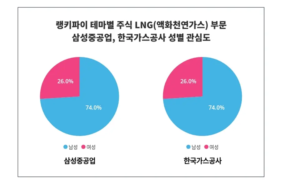성별 관심도 분석에서 삼성중공업은 '남성'에게 '74%'의 관심을 받고 있으며, 삼성중공업은 여성보다 '남성'에게 높은 관심을 받고 있는 것으로 나타났다.이어 한국가스공사는 '남성'에서 '74%'의 높은 관심도가 나타났으며, 여성보다 '남성'에게 더 많은 관심을 받고 있음이 드러났다.