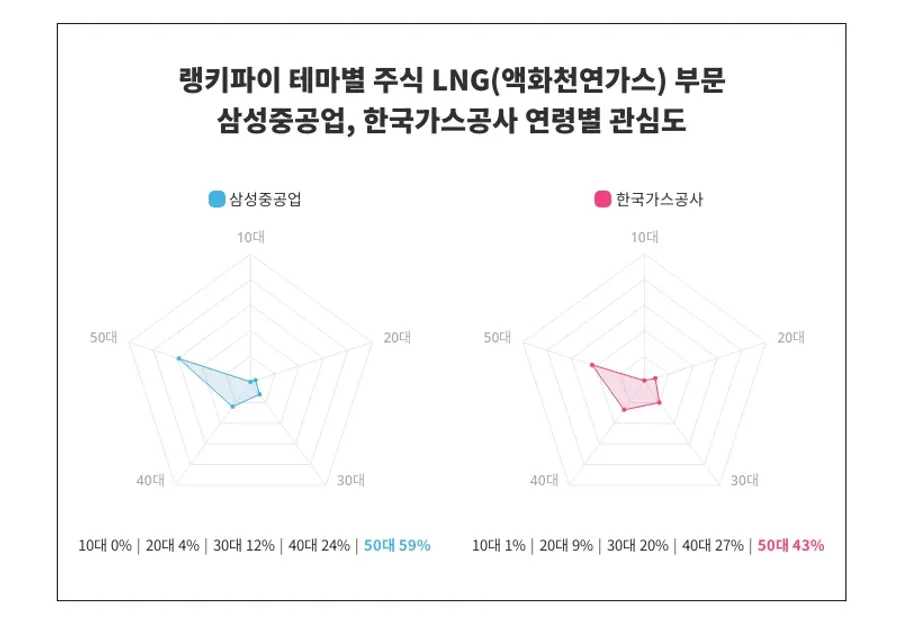 연령별 관심도 조사에 따르면, 삼성중공업과 한국가스공사 사이의 관심도는 각 연령대에서 다양하게 분포되어 있음이 확인되었다. 특히, 삼성중공업은 50대에서 59%의 관심도를 보여 가장 관심도가 높은 것으로 나타났다. 더불어 삼성중공업의 관심도는 10대 0%, 20대 4%, 30대 12%, 40대 24%, 50대 59% 순으로 나타났다.