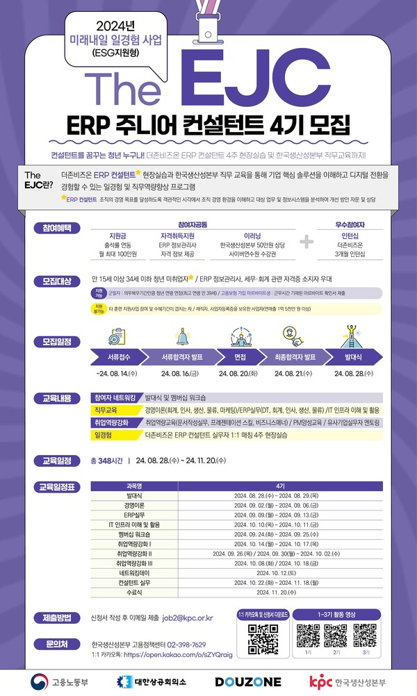 EJC 프로그램은 직무 교육과 현장실습을 병행해, ERP를 쉽게 이해하고 디지털 전환에 필요한 핵심 역량을 갖출 수 있도록 정부지원금을 매월 최대 100만원까지 지원한다. 한국생산성본부의 ERP 정보관리사 자격증 취득을 위한 교육 기회도 제공한다.