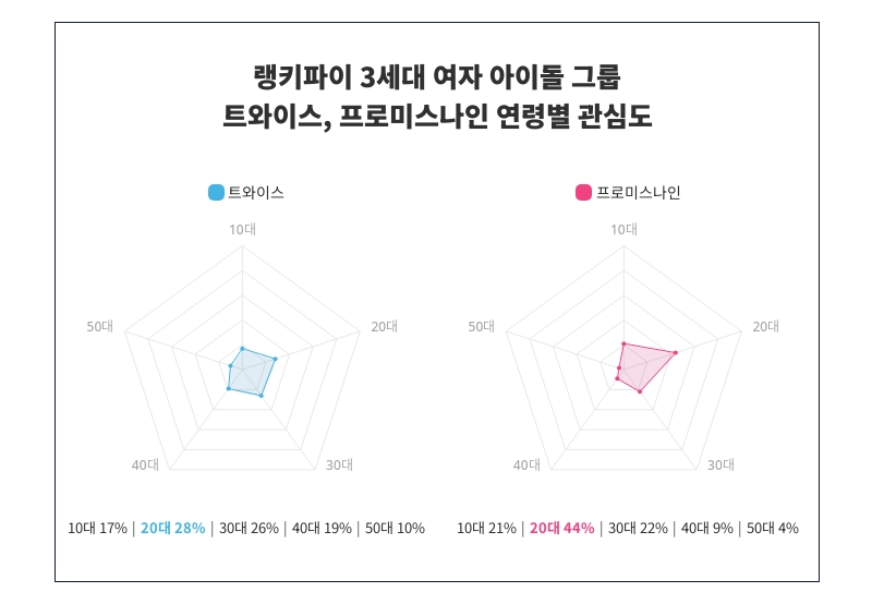 또한 프로미스나인은 20대에서 44%의 높은 관심도를 보이고 있으며, 10대 21%, 20대 44%, 30대 22%, 40대 9%, 50대 4% 순으로 관심을 받고 있다. 이는 두 트렌드의 세대별 관심도를 보여준다.