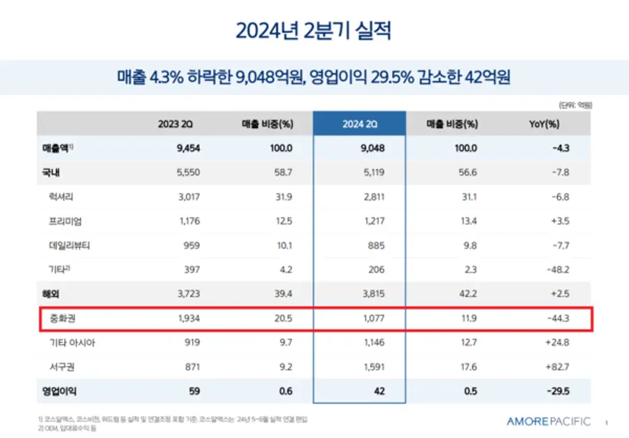 무엇보다 중국 관련 매출 급감이 전사 이익에 영향을 미쳤다고 평가했다. 실적 발표 결과 중국 매출은 지난해 같은 기간보다 54% 감소했고, 영업손실은 390억원에 달한 것으로 추정됐다.