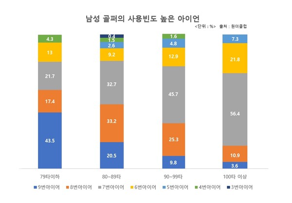 아이언은 일반적으로 8개 이상의 클럽으로 한 세트를 구성하고 있는 것으로 조사됐다. 남성의 경우 고수일수록 페어웨이에서 숏 아이언을 자주 이용하는 반면 여성 골퍼는 타수에 상관없이 7번 아이언의 사용빈도가 높았다.