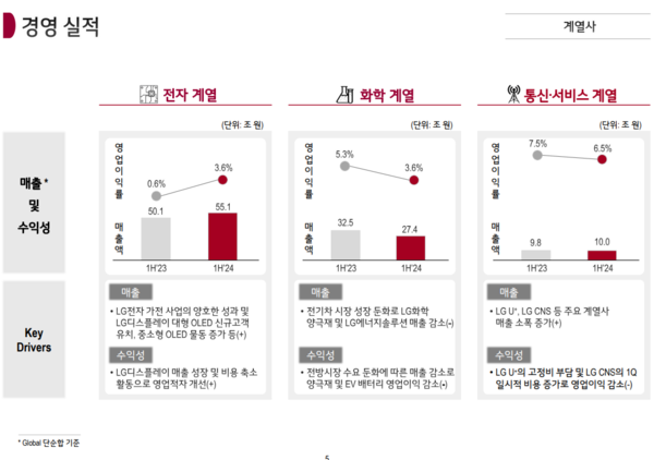 LG는 LG전자 가전사업의 양호한 성과, LG디스플레이의 대형 유기발광다이오드(OLED) 신규 고객 유치, 중소형 OLED 물동 증가 등은 LG 실적에 플러스 요인으로 작용했다고 밝혔다.